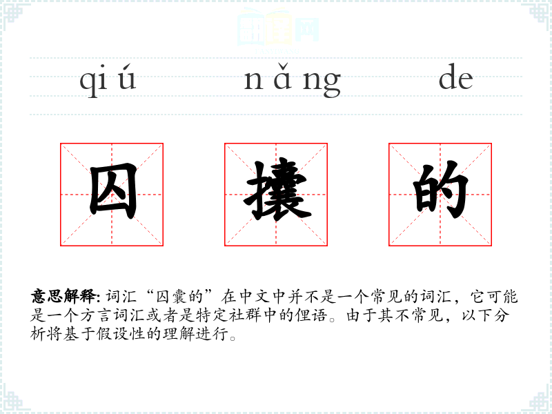 词汇“囚囊的”在中文中并不是一个常见的词汇,它可能是一个方言词汇或者是特定社群中的俚语。由于其不常见,以下分析将基于假设性的理解进行。