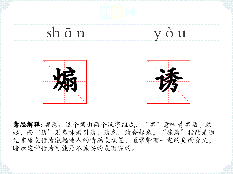 煽诱:这个词由两个汉字组成,“煽”意味着煽动、激起,而“诱”则意味着引诱、诱惑。结合起来,“煽诱”指的是通过言语或行为激起他人的情感或欲望,通常带有一定的负面含义,暗示这种行为可能是不诚实的或有害的。