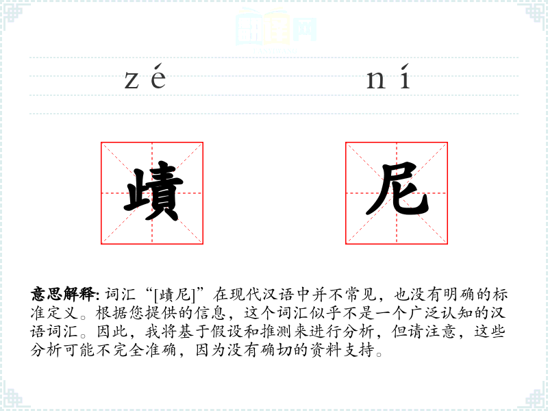 词汇“[歵尼]”在现代汉语中并不常见,也没有明确的标准定义。根据您提供的信息,这个词汇似乎不是一个广泛认知的汉语词汇。因此,我将基于假设和推测来进行分析,但请注意,这些分析可能不完全准确,因为没有确切的资料支持。