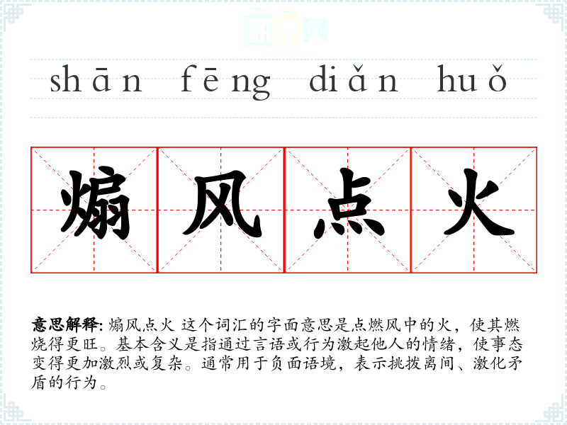煽风点火 这个词汇的字面意思是点燃风中的火,使其燃烧得更旺。基本含义是指通过言语或行为激起他人的情绪,使事态变得更加激烈或复杂。通常用于负面语境,表示挑拨离间、激化矛盾的行为。