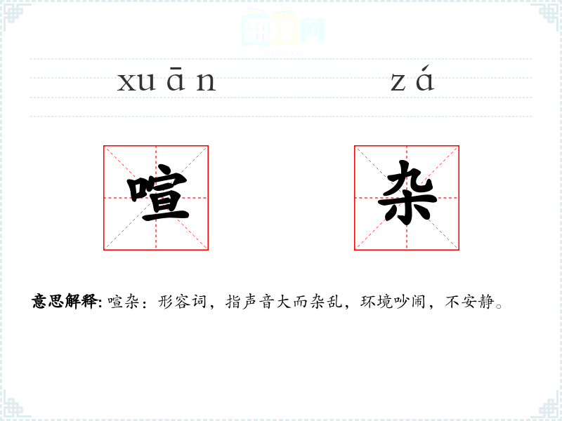 - 同义词:吵闹、喧嚣、嘈杂。这些词都形容声音大且杂乱,但“喧杂”更侧重于声音的杂乱无章。