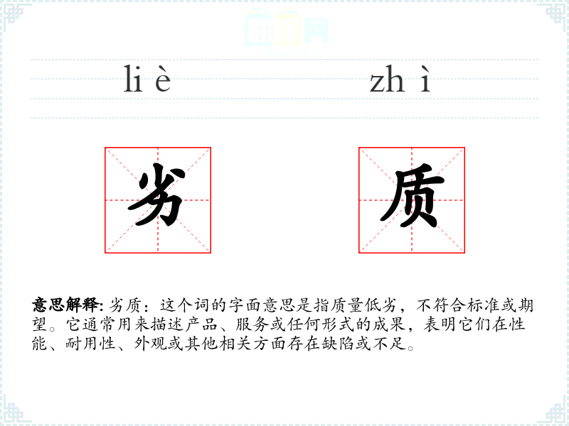 劣质:这个词的字面意思是指质量低劣,不符合标准或期望。它通常用来描述产品、服务或任何形式的成果,表明它们在性能、耐用性、外观或其他相关方面存在缺陷或不足。