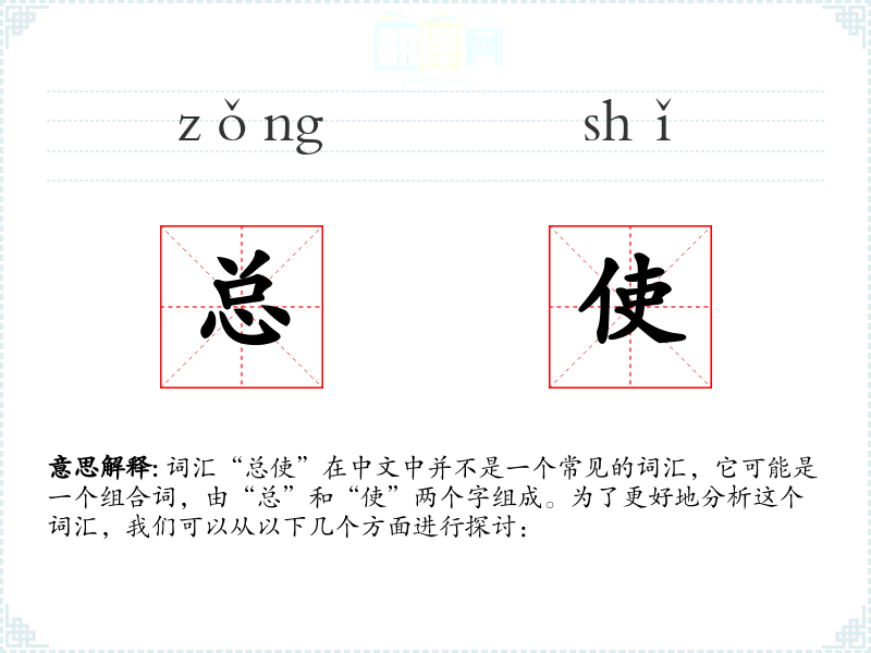 词汇“总使”在中文中并不是一个常见的词汇,它可能是一个组合词,由“总”和“使”两个字组成。为了更好地分析这个词汇,我们可以从以下几个方面进行探讨: