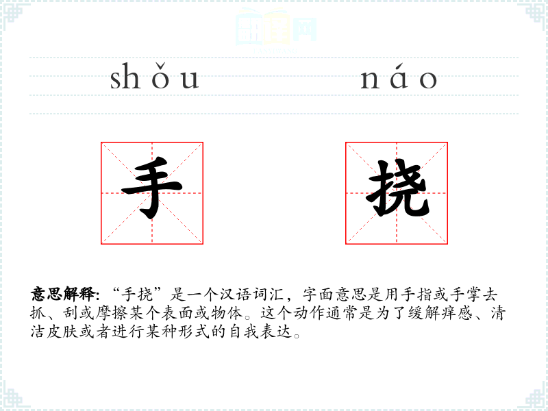 “手挠”是一个汉语词汇,字面意思是用手指或手掌去抓、刮或摩擦某个表面或物体。这个动作通常是为了缓解痒感、清洁皮肤或者进行某种形式的自我表达。