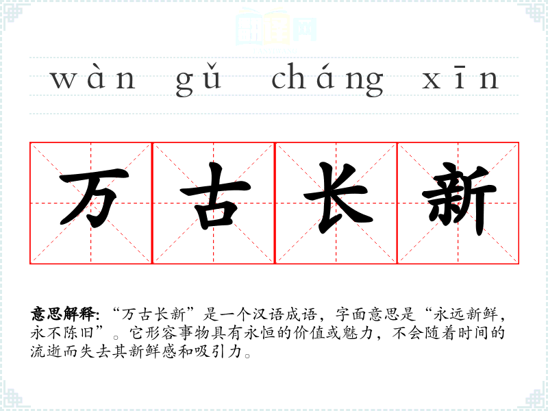 “万古长新”是一个汉语成语,字面意思是“永远新鲜,永不陈旧”。它形容事物具有永恒的价值或魅力,不会随着时间的流逝而失去其新鲜感和吸引力。