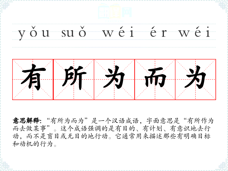 “有所为而为”是一个汉语成语,字面意思是“有所作为而去做某事”。这个成语强调的是有目的、有计划、有意识地去行动,而不是盲目或无目的地行动。它通常用来描述那些有明确目标和动机的行为。