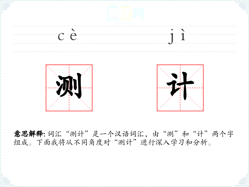 词汇“测计”是一个汉语词汇,由“测”和“计”两个字组成。下面我将从不同角度对“测计”进行深入学*和分析。