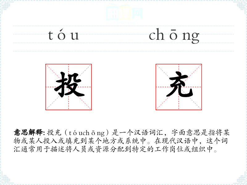 “投充”一词的词源较为直接,由“投”(投入)和“充”(充满、填充)两个字组成。在古代汉语中,这个词汇可能更多用于物质或人员的填充,而在现代汉语中,其使用范围更广,涉及资源和人员的分配。