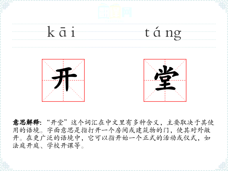“开堂”一词源于古代汉语,其中“开”字意为打开或开始,“堂”字最初指堂屋,即家庭或官府中的大厅。随着时间的推移,“堂”的含义扩展到更广泛的公共场所,如法庭、学校等。