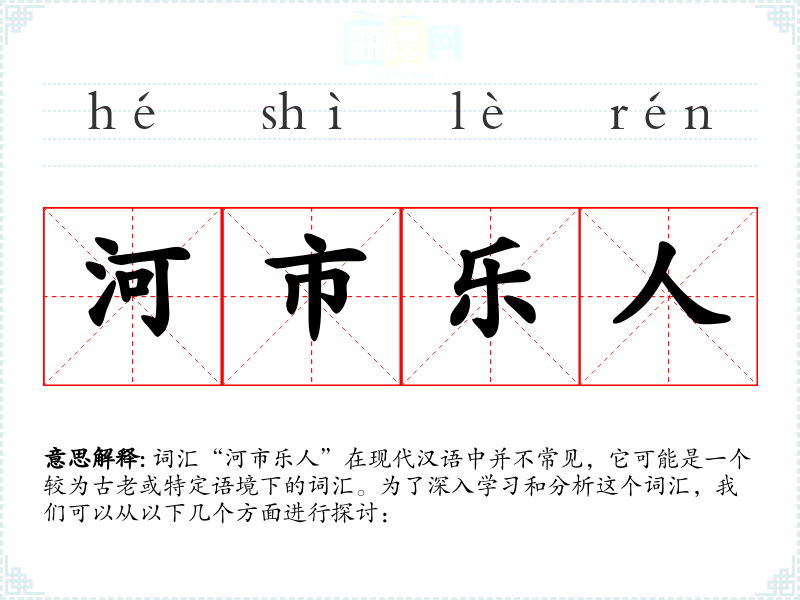词汇“河市乐人”在现代汉语中并不常见,它可能是一个较为古老或特定语境下的词汇。为了深入学习和分析这个词汇,我们可以从以下几个方面进行探讨:
