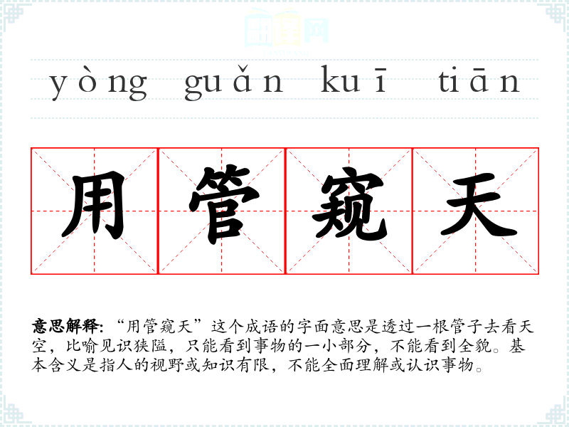 “用管窥天”出自《庄子·秋水》:“是直用管窥天,用锥指地也,不亦小乎?”原意是通过狭窄的管道看天空,比喻视野狭窄。随着时间的推移,这个成语的含义逐渐固定,成为形容人见识狭隘的常用语。