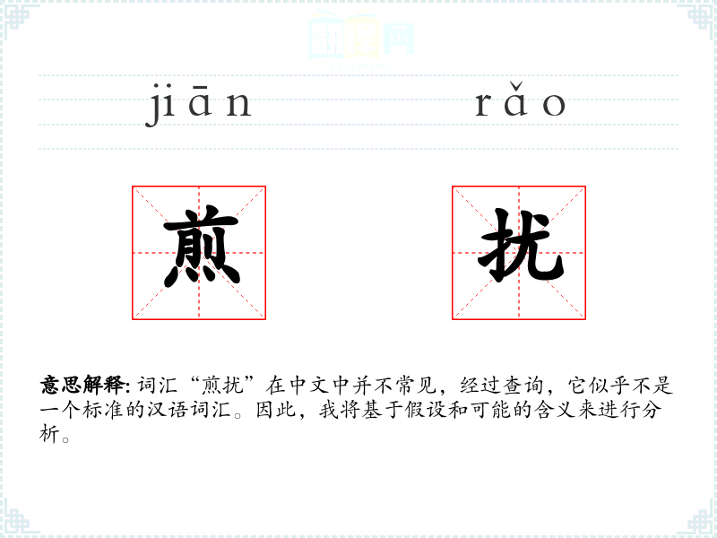 词汇“煎扰”在中文中并不常见,经过查询,它似乎不是一个标准的汉语词汇。因此,我将基于假设和可能的含义来进行分析。