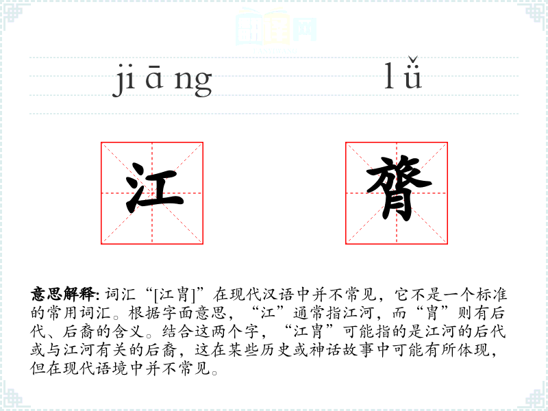 词汇“[江胄]”在现代汉语中并不常见,它不是一个标准的常用词汇。根据字面意思,“江”通常指江河,而“胄”则有后代、后裔的含义。结合这两个字,“江胄”可能指的是江河的后代或与江河有关的后裔,这在某些历史或神话故事中可能有所体现,但在现代语境中并不常见。
