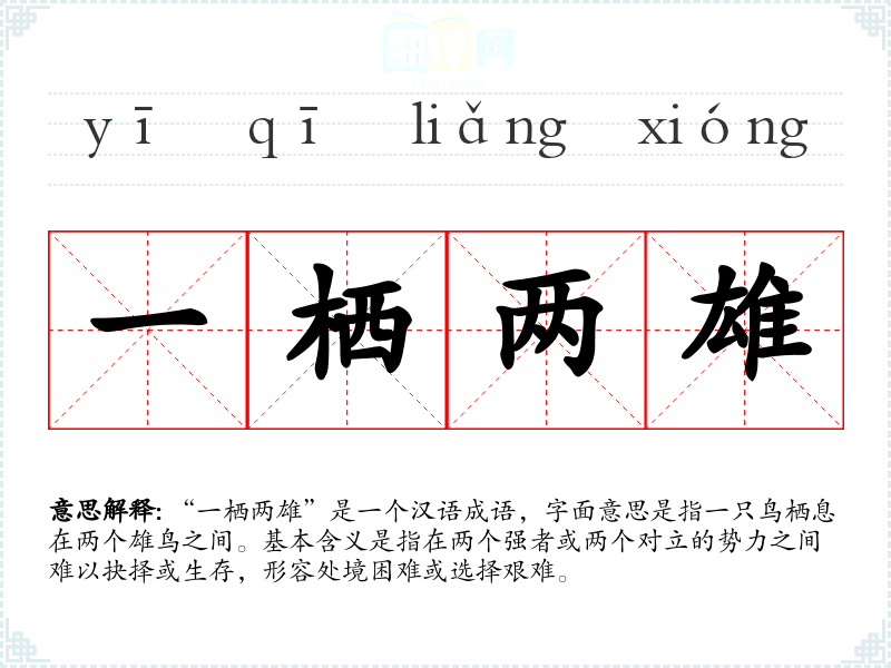 “一栖两雄”是一个汉语成语,字面意思是指一只鸟栖息在两个雄鸟之间。基本含义是指在两个强者或两个对立的势力之间难以抉择或生存,形容处境困难或选择艰难。
