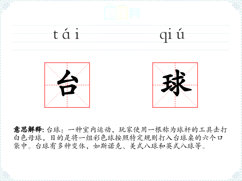 "台球"的意思解释、台球是什么意思由翻译网汉语词典查词提供。
