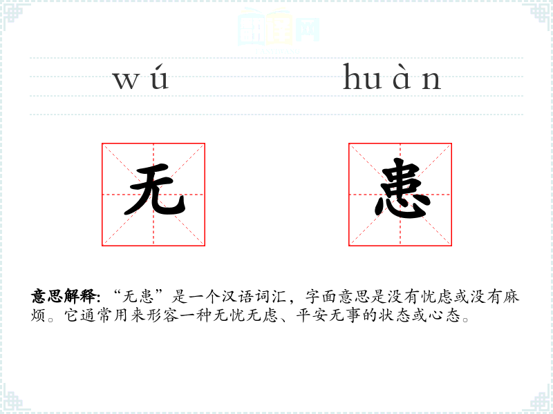 “无患”是一个汉语词汇,字面意思是没有忧虑或没有麻烦。它通常用来形容一种无忧无虑、平安无事的状态或心态。