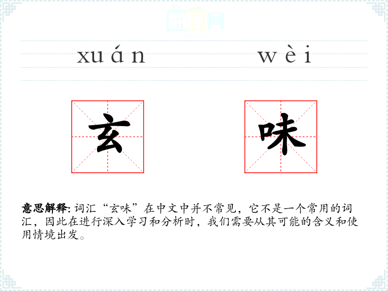 “玄味”这个词虽然不常用,但它提供了一种描述深奥、神秘意味的方式,对于理解和表达某些深层次的思想或艺术作品具有一定的价值。在学*语言和表达时,了解和掌握这样的词汇可以丰富我们的表达能力。