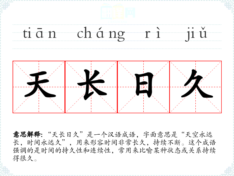 在**文化中,时间被视为一种宝贵的资源,因此“天长日久”这个成语也常用来强调坚持和耐心的重要性。在社会交往中,这个成语可能用来形容某种关系的稳定性和持久性。