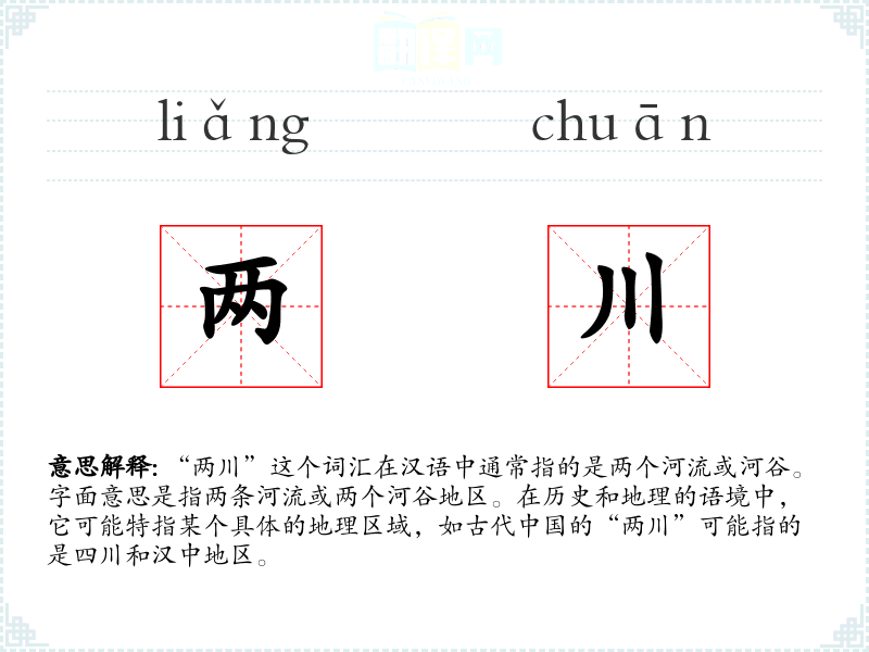 “两川”这个词汇在汉语中具有特定的地理和历史含义,它不仅描述了一个自然现象,也承载了丰富的文化和历史信息。在语言学*和表达中,理解和正确使用这样的词汇可以增强语言的准确性和表达的深度。