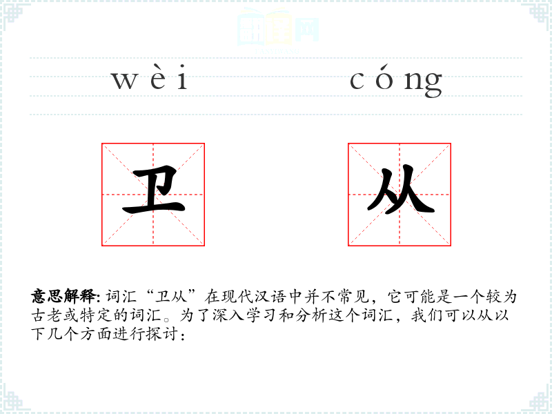 词汇“卫从”在现代汉语中并不常见,它可能是一个较为古老或特定的词汇。为了深入学*和分析这个词汇,我们可以从以下几个方面进行探讨: