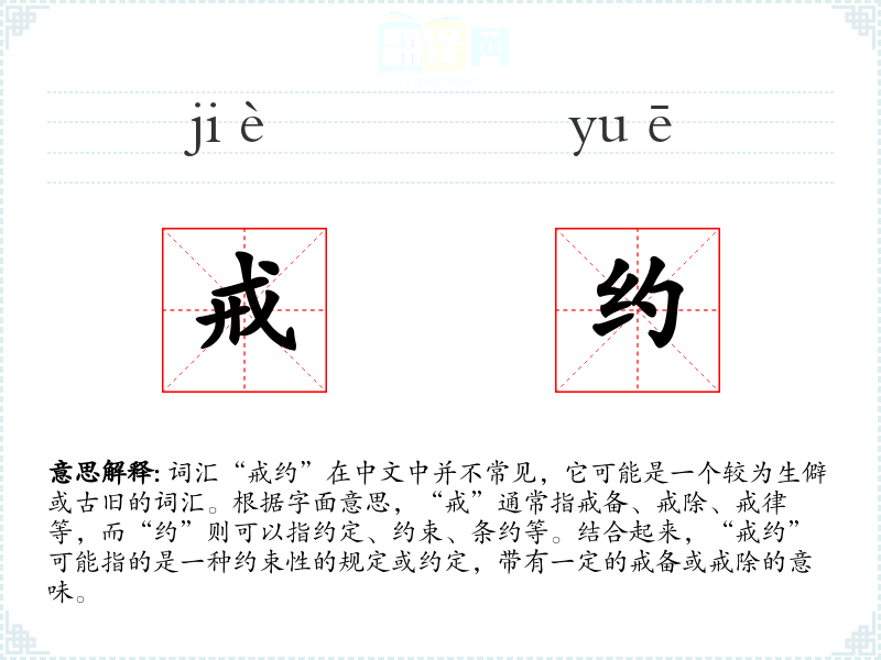 “戒约”作为一个较为生僻的词汇,其含义和使用场景相对有限。在语言学*和表达中,了解这样的词汇可以帮助我们更好地理解语言的丰富性和历史背景。尽管在现代生活中使用频率不高,但在特定的语境中,它仍然是一个有用的词汇。