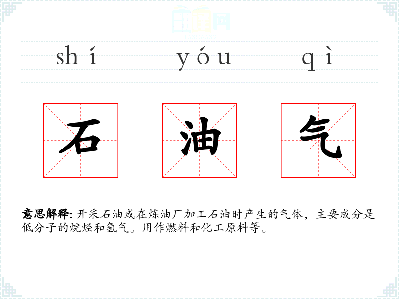 开采石油或在炼油厂加工石油时产生的气体,主要成分是低分子的烷烃和氢气。用作燃料和化工原料等。