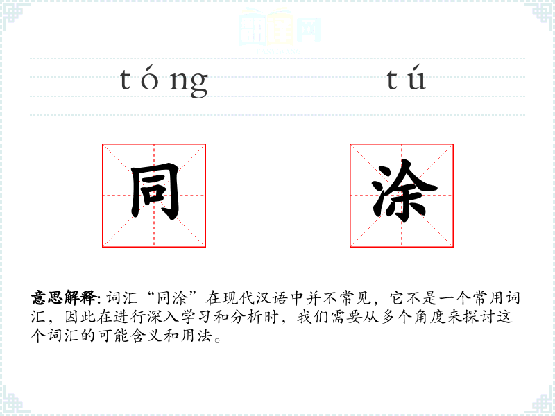 词汇“同涂”在现代汉语中并不常见,它不是一个常用词汇,因此在进行深入学*和分析时,我们需要从多个角度来探讨这个词汇的可能含义和用法。