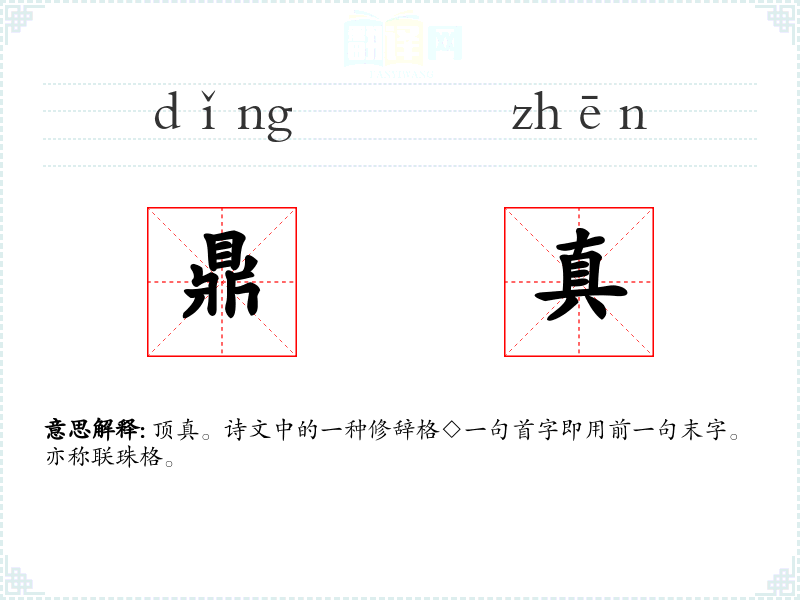 顶真。诗文中的一种修辞格◇一句首字即用前一句末字。亦称联珠格。