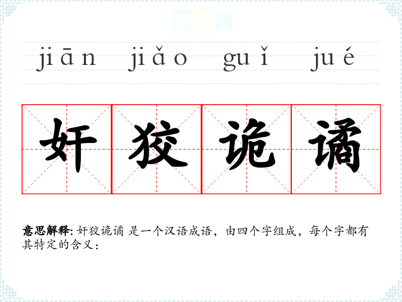 奸狡诡谲 是一个汉语成语,由四个字组成,每个字都有其特定的含义: