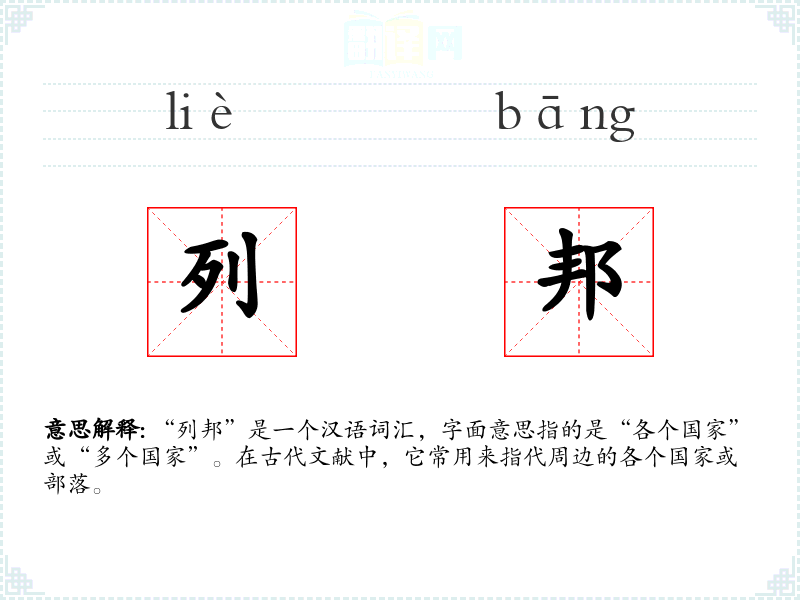 “列邦”是一个汉语词汇,字面意思指的是“各个国家”或“多个国家”。在古代文献中,它常用来指代周边的各个国家或部落。