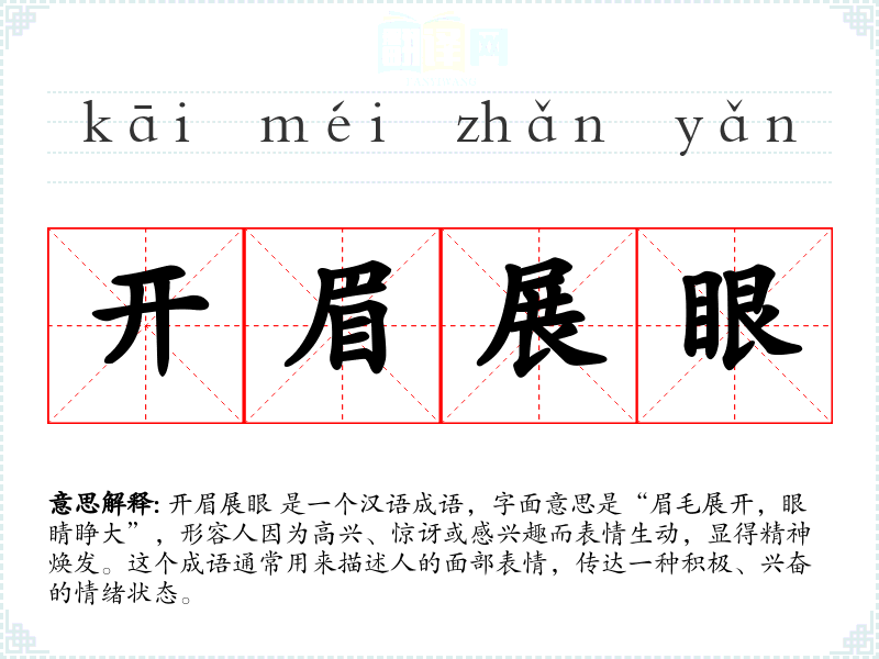 开眉展眼 是一个汉语成语,字面意思是“眉毛展开,眼睛睁大”,形容人因为高兴、惊讶或感兴趣而表情生动,显得精神焕发。这个成语通常用来描述人的面部表情,传达一种积极、兴奋的情绪状态。
