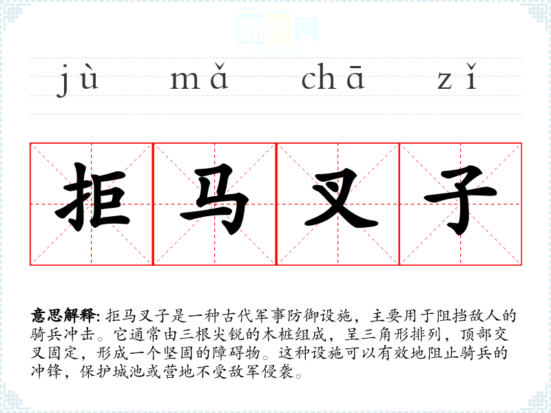 - 拒马桩:指用于阻挡马匹的木桩,包括拒马叉子在内的各种形式。