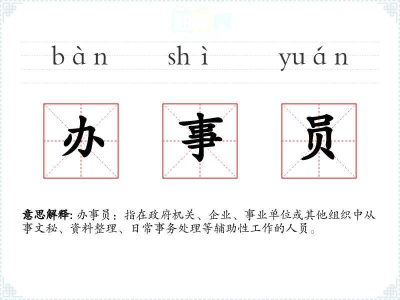 - 口语:在日常对话中,办事员可能被简称为“办员”,用于指代那些在办公室处理日常事务的人。