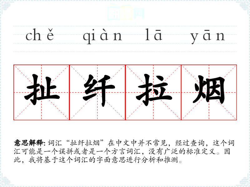 词汇“扯纤拉烟”在中文中并不常见,经过查询,这个词汇可能是一个误拼或者是一个方言词汇,没有广泛的标准定义。因此,我将基于这个词汇的字面意思进行分析和推测。