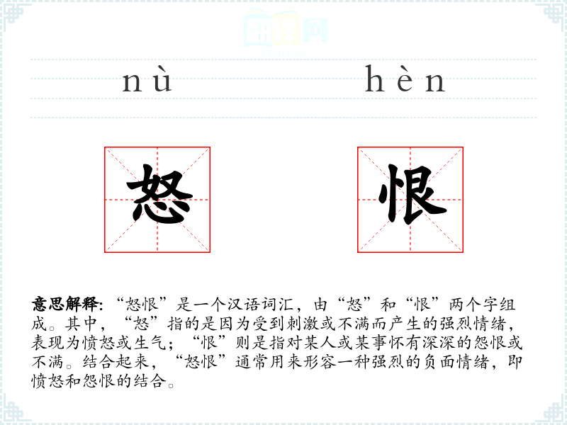“怒”和“恨”都是古老的汉字,其词源可以追溯到古代汉语。在古代文献中,如《诗经》、《左传》等,已有使用“怒”和“恨”的记录。随着时间的推移,这两个字的意义和用法逐渐丰富和演变,形成了现代汉语中的“怒恨”一词。