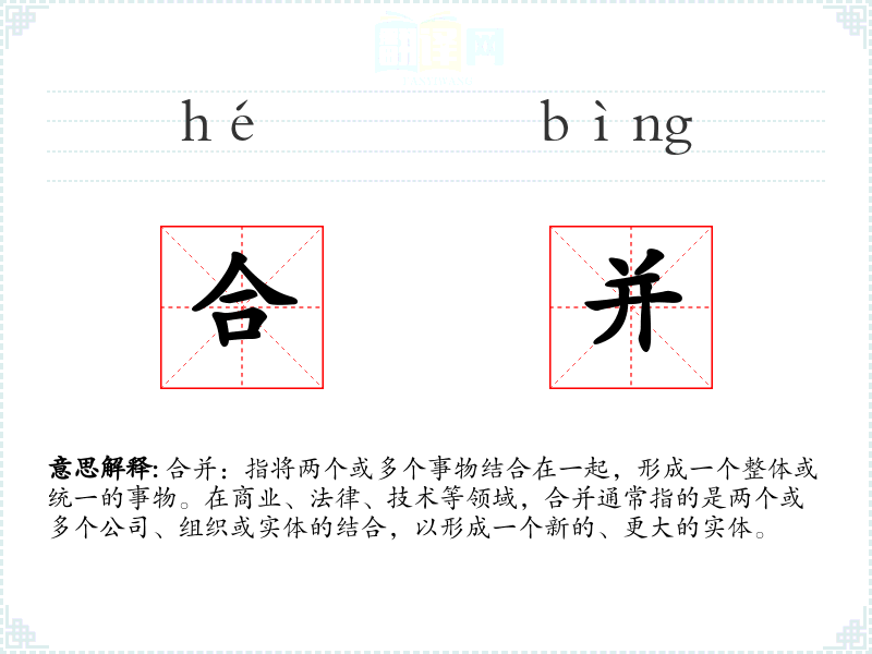 合并:指将两个或多个事物结合在一起,形成一个整体或统一的事物。在商业、法律、技术等领域,合并通常指的是两个或多个公司、组织或实体的结合,以形成一个新的、更大的实体。