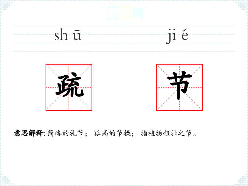 简略的礼节; 孤高的节操; 指植物粗壮之节。