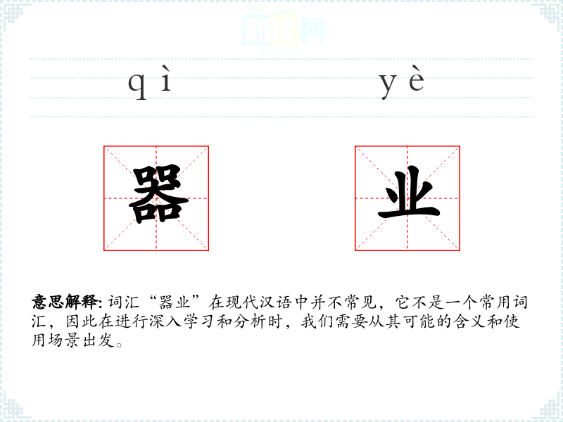 词汇“器业”在现代汉语中并不常见,它不是一个常用词汇,因此在进行深入学*和分析时,我们需要从其可能的含义和使用场景出发。