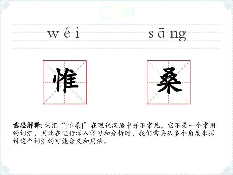 词汇“[惟桑]”在现代汉语中并不常见,它不是一个常用的词汇,因此在进行深入学*和分析时,我们需要从多个角度来探讨这个词汇的可能含义和用法。