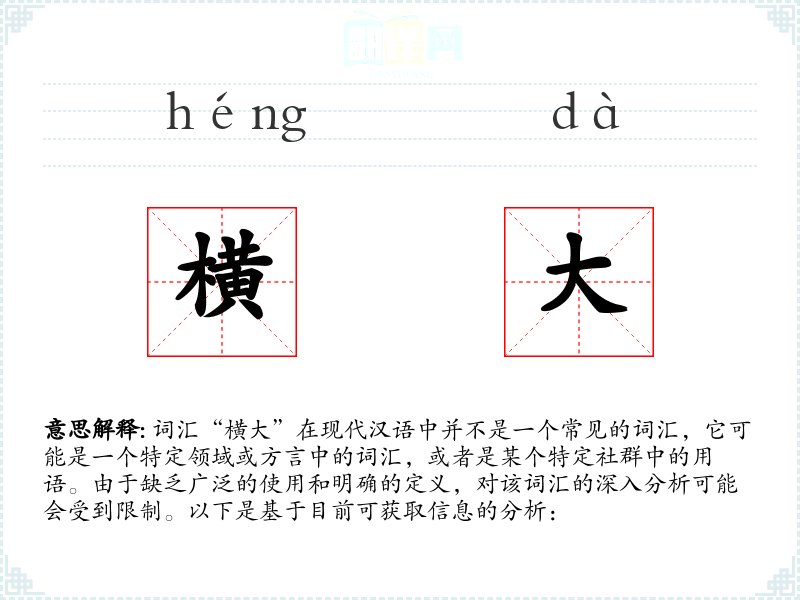 词汇“横大”在现代汉语中并不是一个常见的词汇,它可能是一个特定领域或方言中的词汇,或者是某个特定社群中的用语。由于缺乏广泛的使用和明确的定义,对该词汇的深入分析可能会受到限制。以下是基于目前可获取信息的分析: