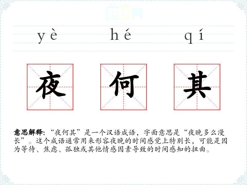 “夜何其”是一个汉语成语,字面意思是“夜晚多么漫长”。这个成语通常用来形容夜晚的时间感觉上特别长,可能是因为等待、焦虑、孤独或其他情感因素导致的时间感知的扭曲。