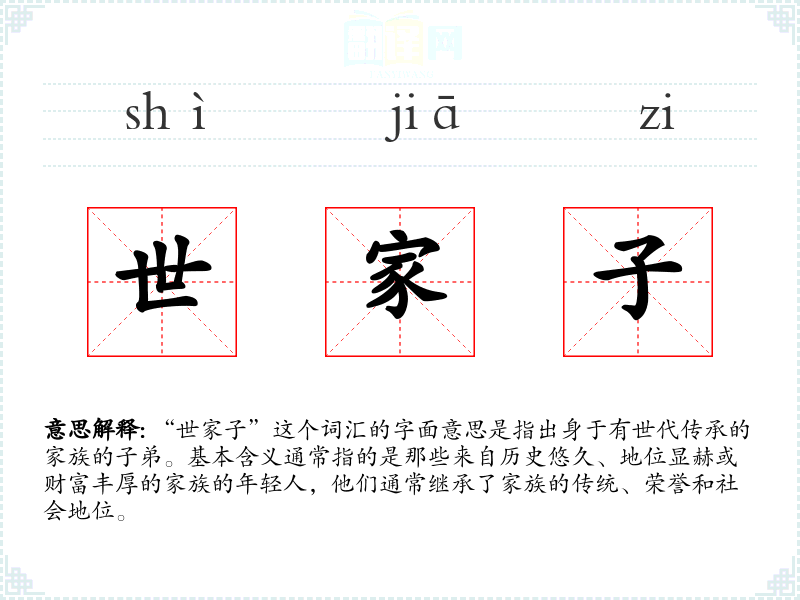 “世家子”这个词汇的字面意思是指出身于有世代传承的家族的子弟。基本含义通常指的是那些来自历史悠久、地位显赫或财富丰厚的家族的年轻人,他们通常继承了家族的传统、荣誉和社会地位。