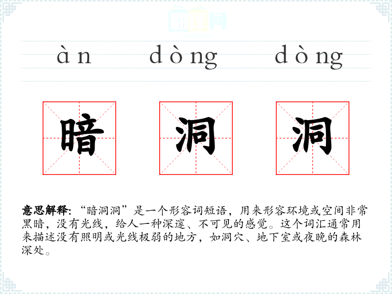 “暗洞洞”是一个形容词短语,用来形容环境或空间非常黑暗,没有光线,给人一种深邃、不可见的感觉。这个词汇通常用来描述没有照明或光线极弱的地方,如洞穴、地下室或夜晚的森林深处。