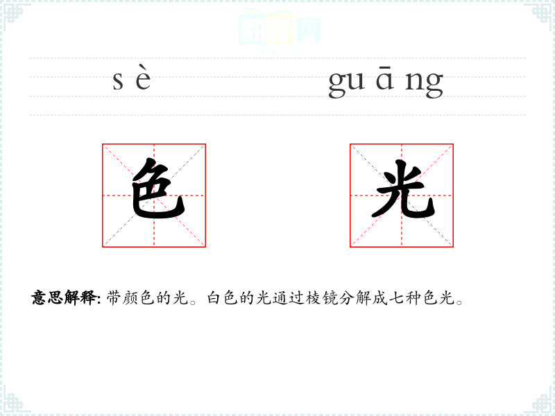 带颜色的光。白色的光通过棱镜分解成七种色光。