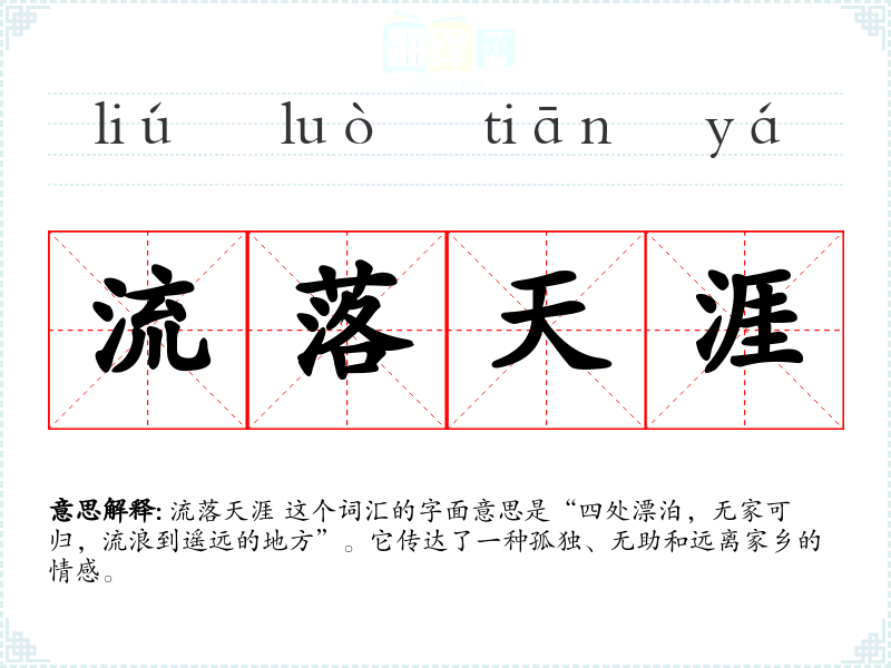流落天涯 这个词汇的字面意思是“四处漂泊,无家可归,流浪到遥远的地方”。它传达了一种孤独、无助和远离家乡的情感。