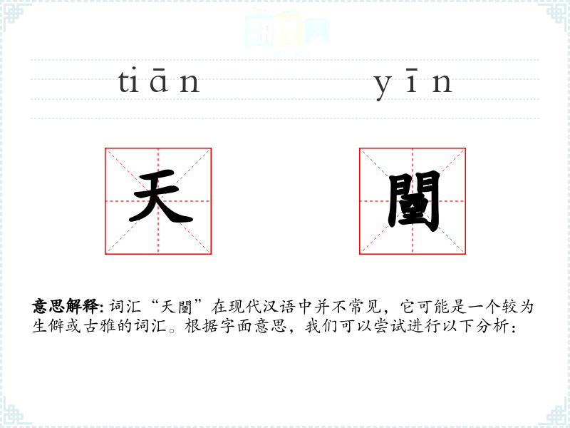 词汇“天闉”在现代汉语中并不常见,它可能是一个较为生僻或古雅的词汇。根据字面意思,我们可以尝试进行以下分析: