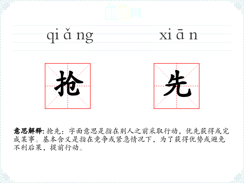 抢先:字面意思是指在别人之前采取行动,优先获得或完成某事。基本含义是指在竞争或紧急情况下,为了获得优势或避免不利后果,提前行动。