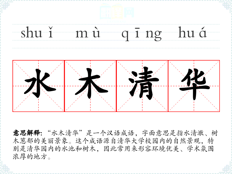 “水木清华”是一个汉语成语,字面意思是指水清澈、树木葱郁的美丽景象。这个成语源自清华大学校园内的自然景观,特别是清华园内的水池和树木,因此常用来形容环境优美、学术氛围浓厚的地方。