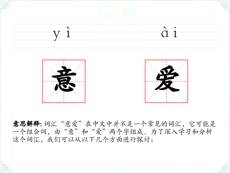 - 由于“意爱”不是一个常见词汇,其在不同语言或文化中的对应词汇不太明确,可能需要根据具体语境进行翻译和理解。
