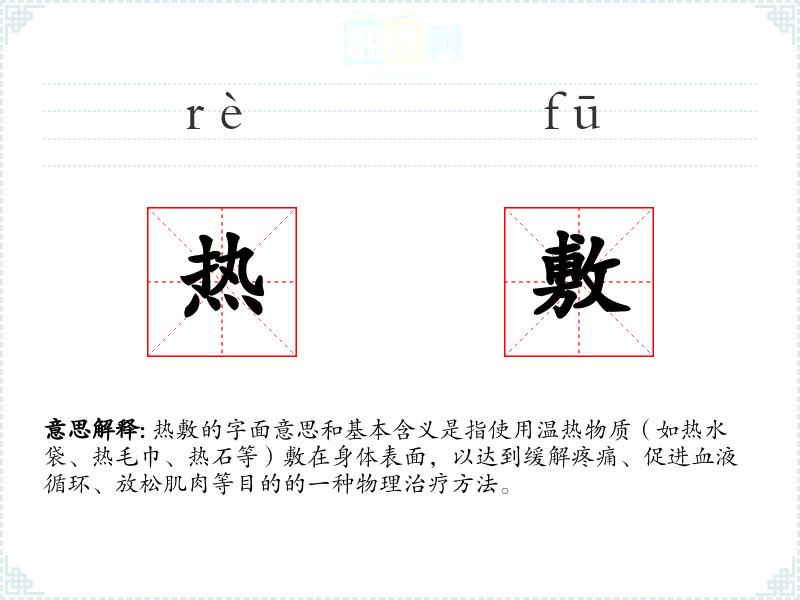 热敷的字面意思和基本含义是指使用温热物质(如热水袋、热毛巾、热石等)敷在身体表面,以达到缓解疼痛、促进血液循环、放松肌肉等目的的一种物理治疗方法。